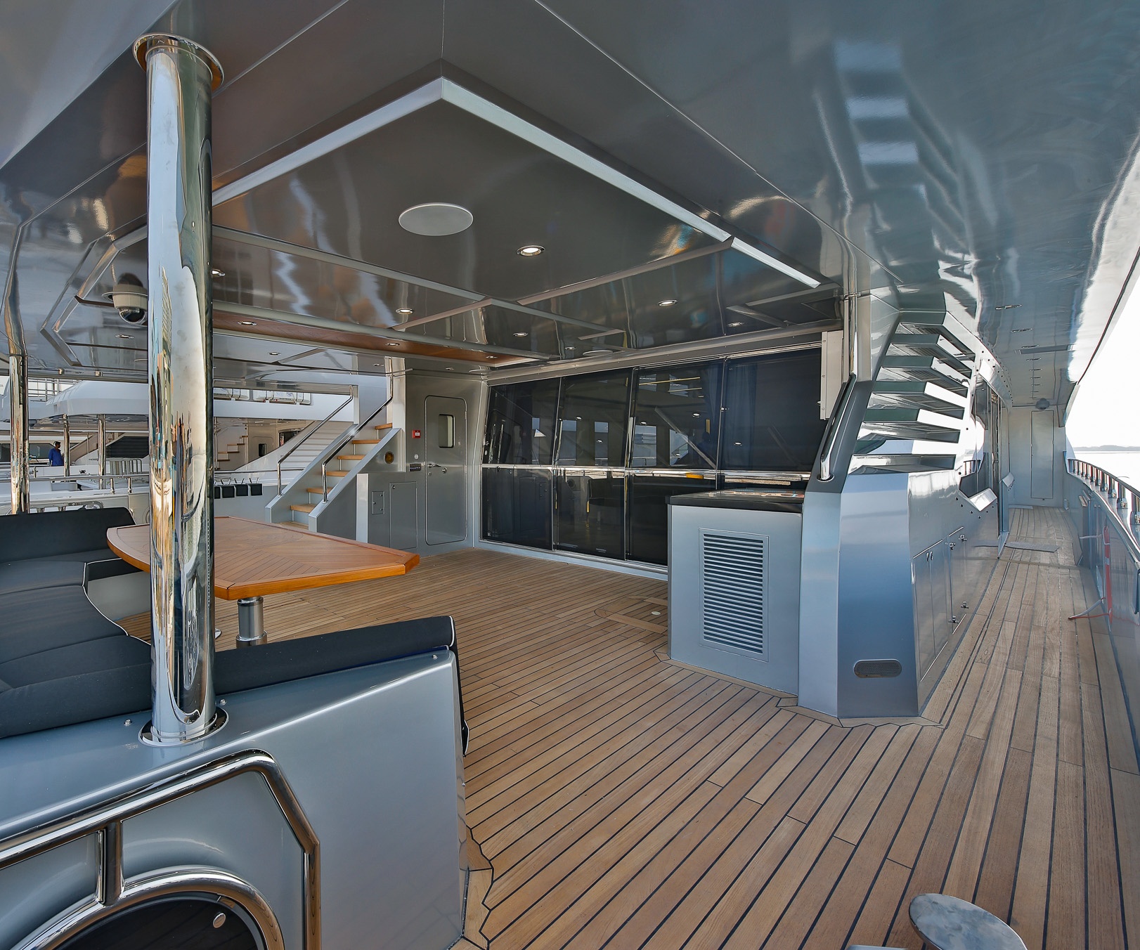 Adjacent to the salon is the shaded aft deck and alfresco dining option, perfect for socializing and entertaining. The foredeck offers a further alfresco dining table and plenty of space to soak up the sun. On the sundeck, guests can enjoy yet another alfresco dining option, have a refreshing cocktail at the wet bar and sun in style.