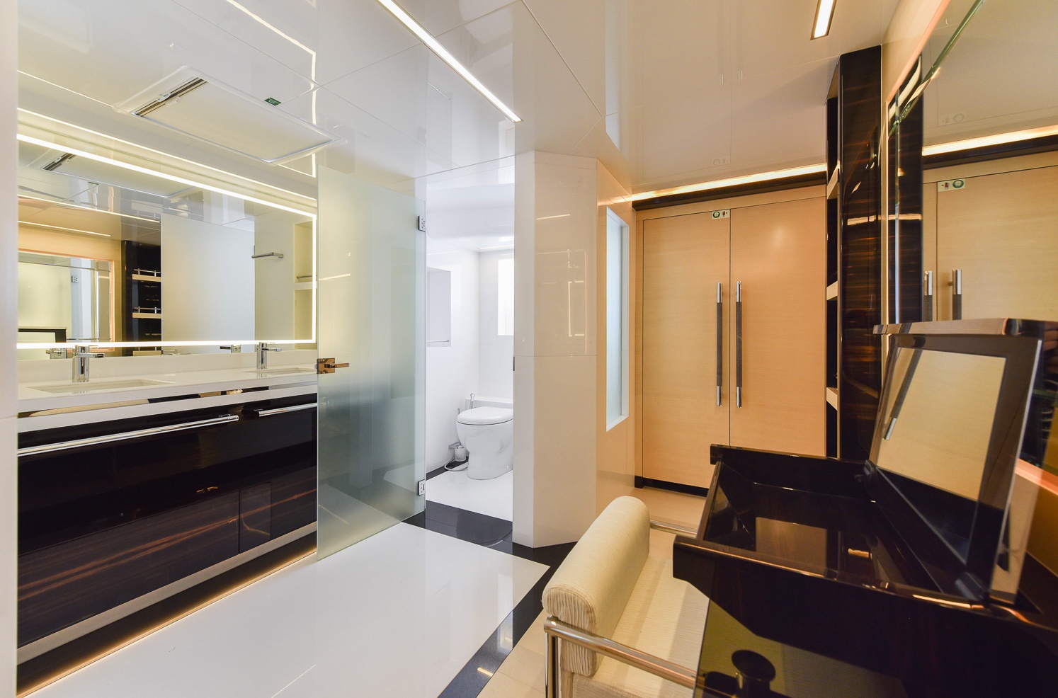 Accommodation is in 5 cabins, each of which offer private ensuite facilities. On the main deck is the master cabin, forward and full beam of the yacht, with a center lined king size bed, walk in wardrobe, powder room and owners office upon entrance.