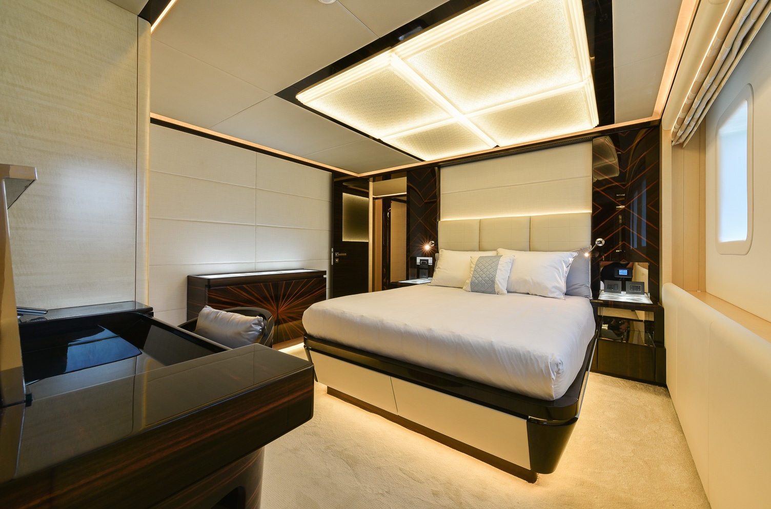 Adjacent to the salon is the shaded aft deck and alfresco dining option, perfect for socializing and entertaining. The foredeck offers a further alfresco dining table and plenty of space to soak up the sun. On the sundeck, guests can enjoy yet another alfresco dining option, have a refreshing cocktail at the wet bar and sun in style.