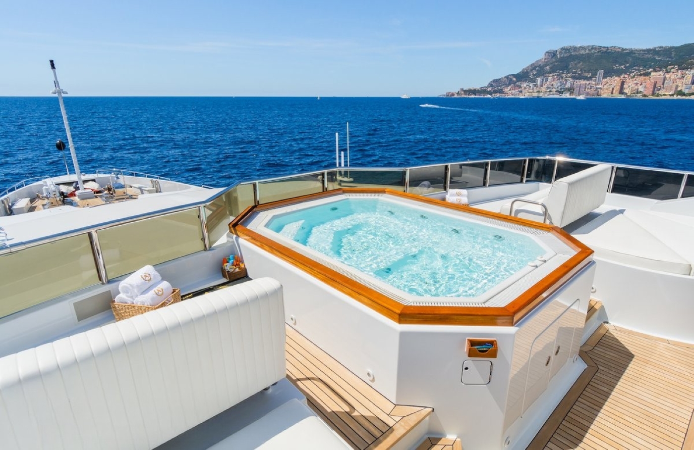 On the upper deck aft, there is a stunning alfresco dining table seating up to 10 guests for formal meals in the fresh air and sunshine.