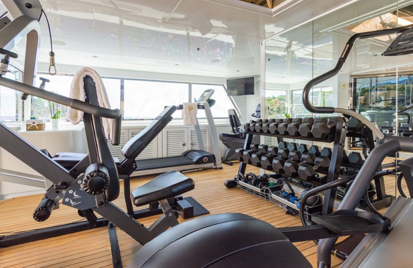 On the sundeck, the forward and aft decks are separated by the indoor gym, which has a comprehensive range of equipment for guests to maintain a ...