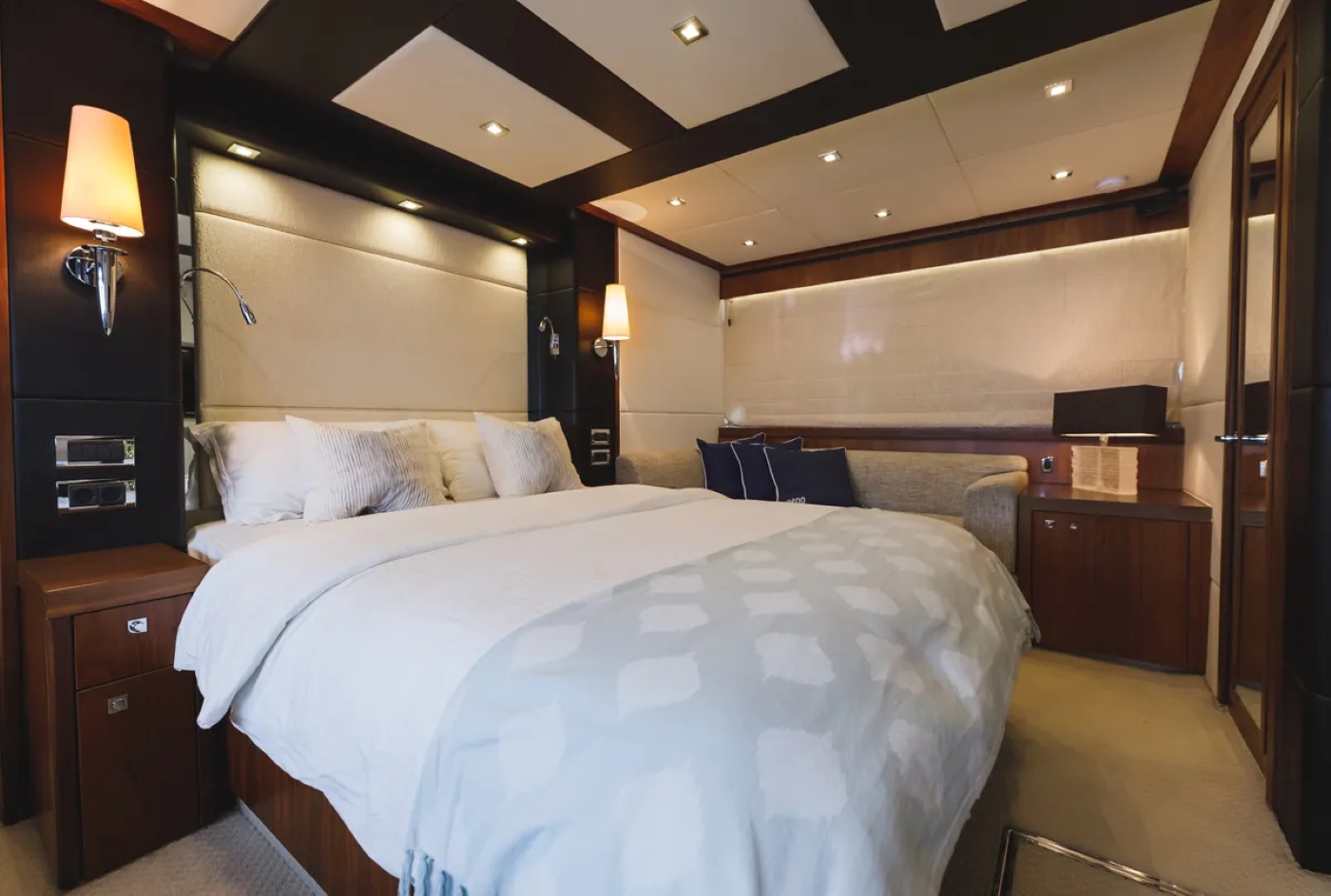 Accommodation is on the lower deck, consisting of 1 master cabin with a full beam layout, king-size bed, walk-in wardrobe and spacious en-suite. The VIP cabin offers a king-size bed, while the twin cabins have side by side single beds.