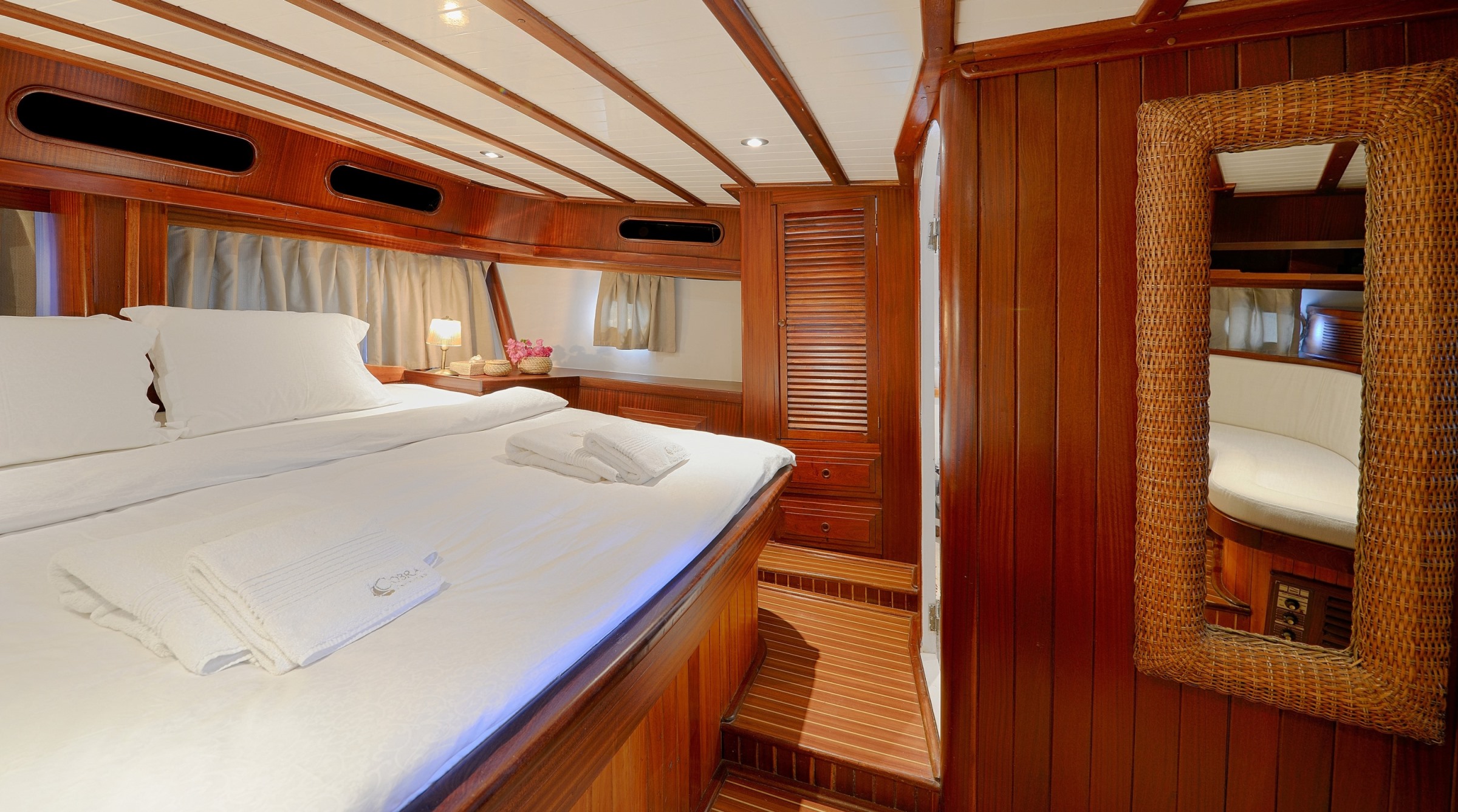 The interior design of this vessel of classical pine planking was styled by Cobra Yacht. Each cabin has a deadlight, wardrobe, drawers, mirror, safe box and smoke detector along with its private bathroom and toilet.