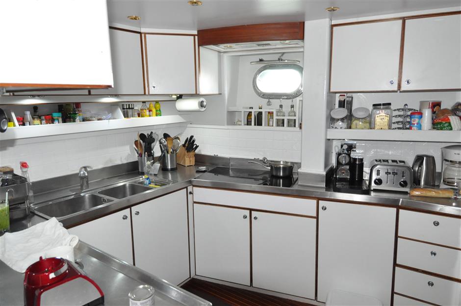 Forward of the main salon is the galley, fully equipped for preparation and serving of delicious meals.