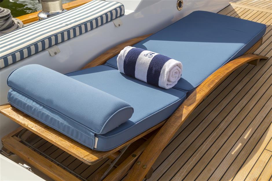 Sunbathing area is on the aft deck, with sun loungers and additional seating.