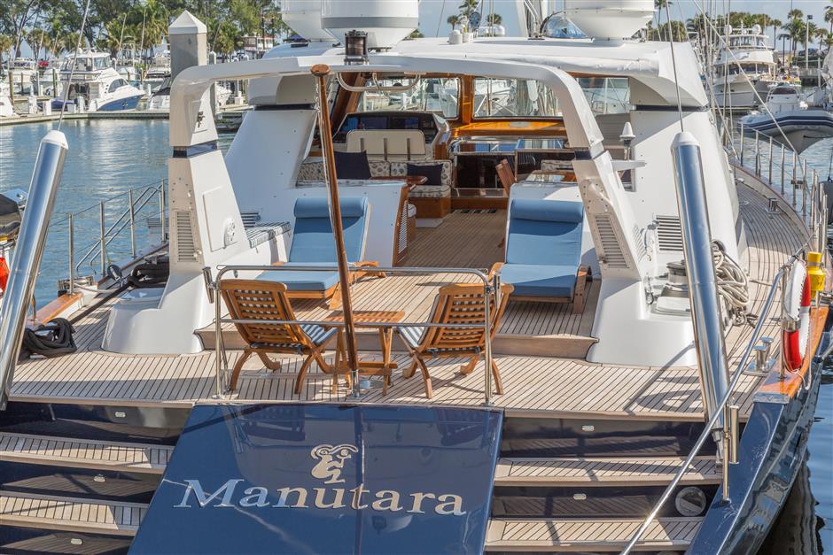 Sunbathing area is on the aft deck, with sun loungers and additional seating.
