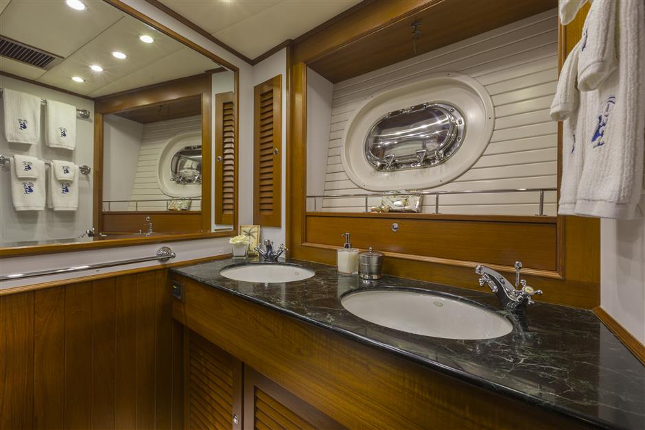 Private master suite is the full width of the yacht, allows ample room for a queen bed, settee berth, and desk/vanity.