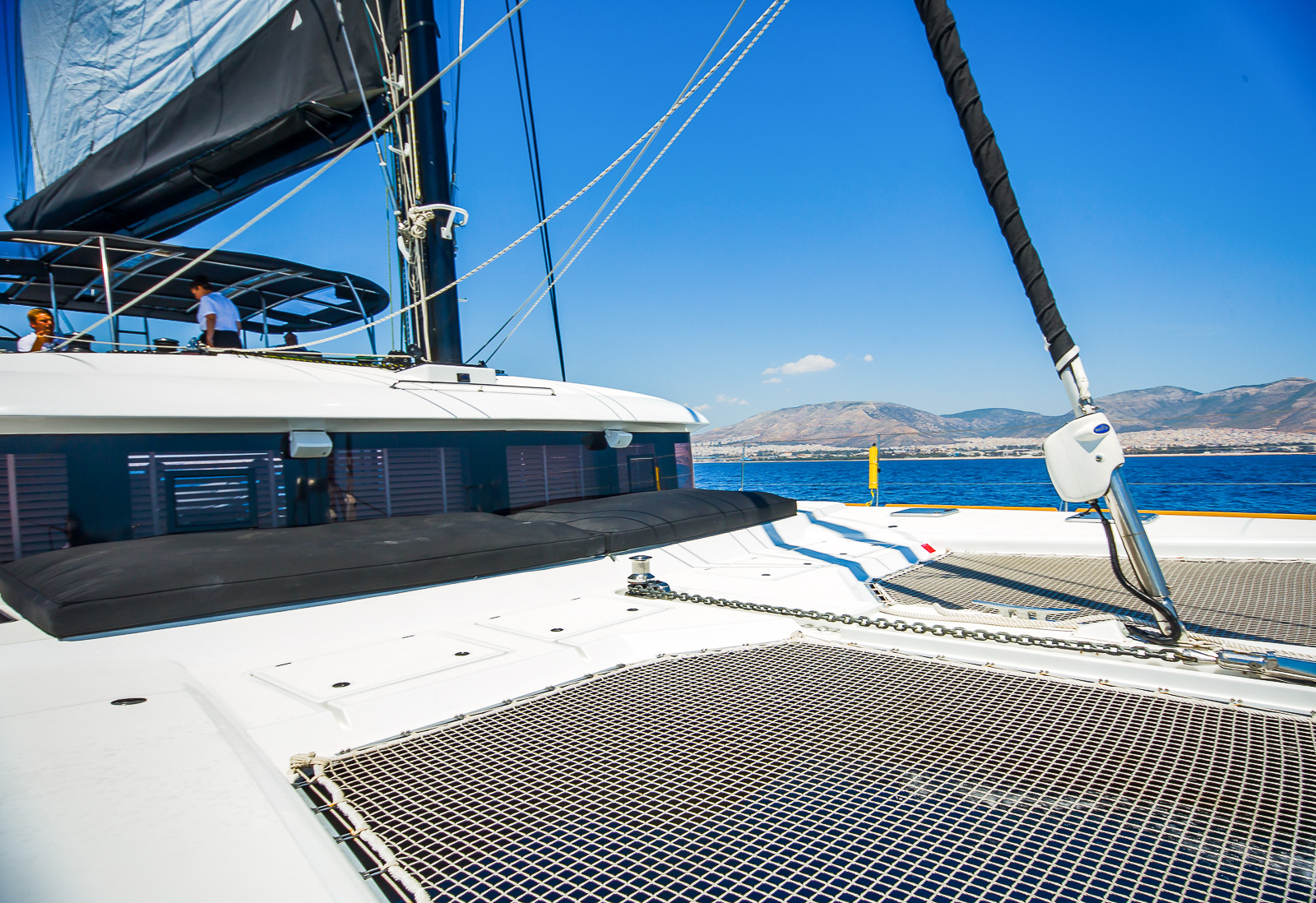 On the foredeck, 2 safety trampolines welcome guests to soak up the sun or simply unwind with a book. The upper deck offers additional sunning and seating areas and partial shade.