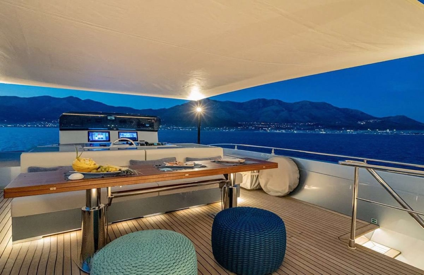 The exterior living is laid over three spacious decks. On the main deck, adjacent to the salon, wide sliding doors give direct access to the aft deck and alfresco dining. The aft deck is shaded and leads down to the extended swim platform and water toys activity area. On her upper deck is a further alfresco dining table.
