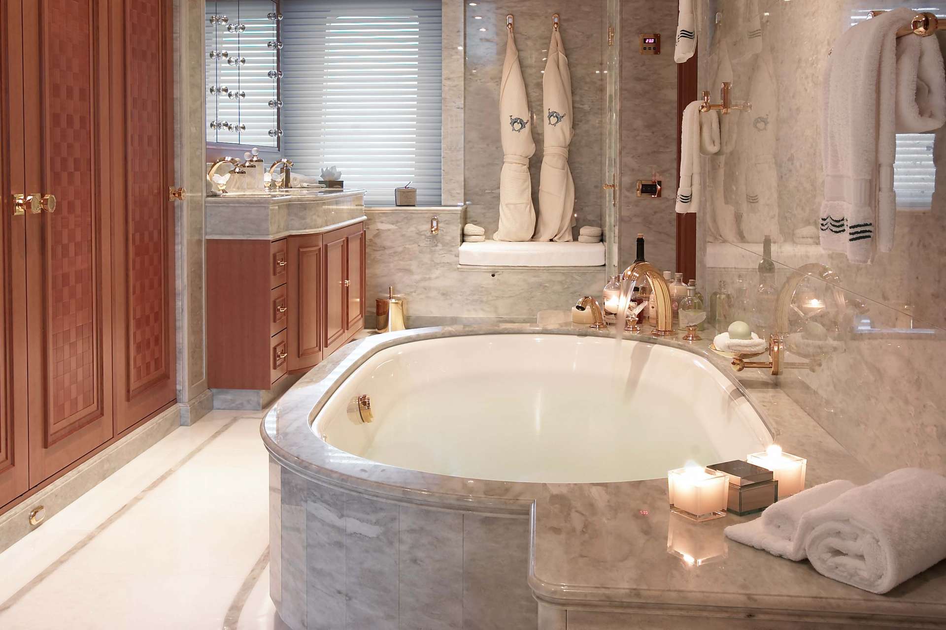 The master cabins feature a full beam layout, two walk-in wardrobes, full beam en-suite with tub and sauna, vanity and study desk. Her upper deck has a spacious sky lounge with ample seating, tables and wet bar, perfect for entertaining.
