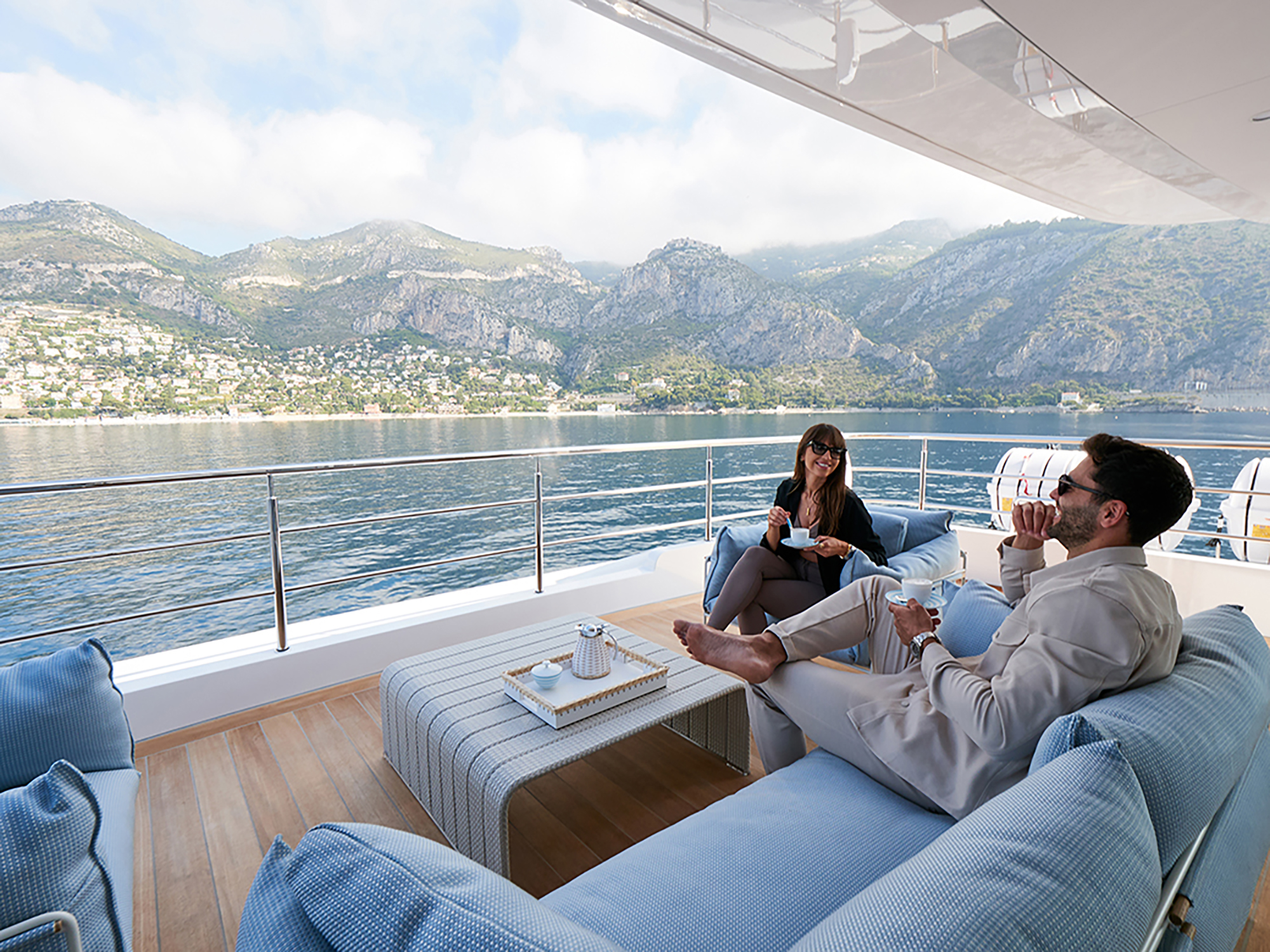 From the swim platform, staircases connect to the main deck aft where the stern contains two separate sunbathing areas fitted with spongy sun pads.