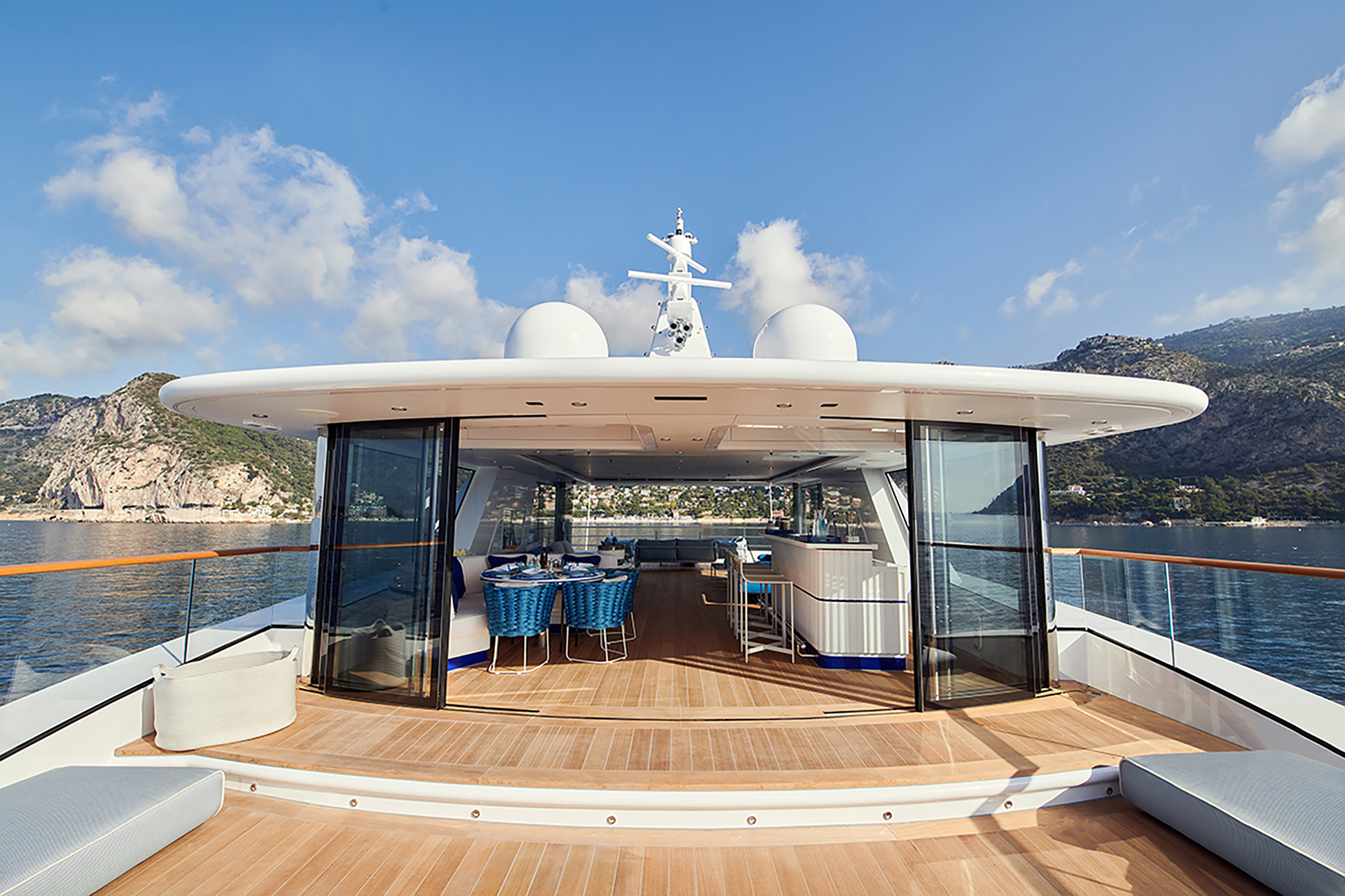 From the swim platform, staircases connect to the main deck aft where the stern contains two separate sunbathing areas fitted with spongy sun pads.