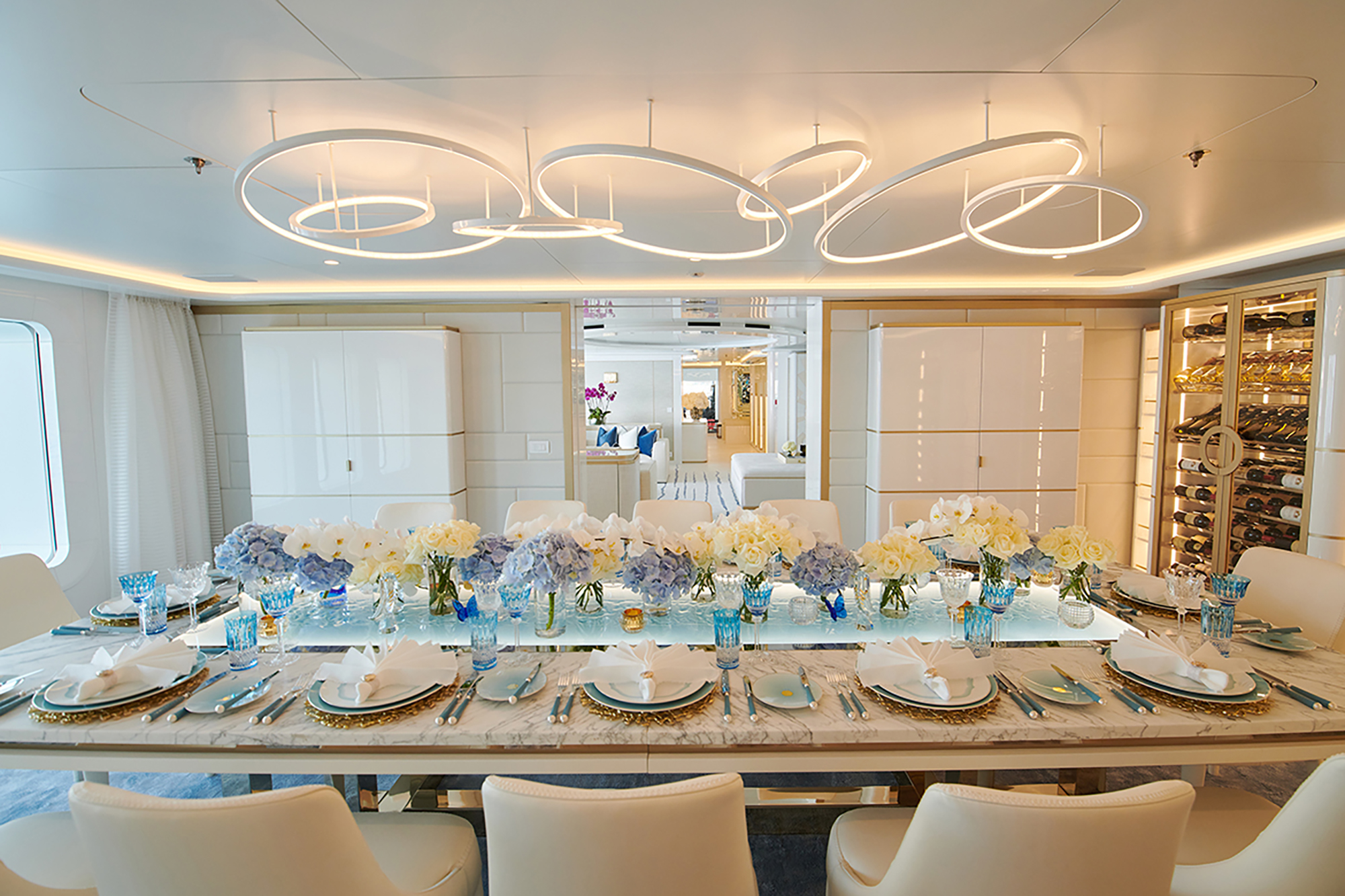 From the swim platform, staircases connect to the main deck aft where the stern contains two separate sunbathing areas fitted with spongy sun pads.