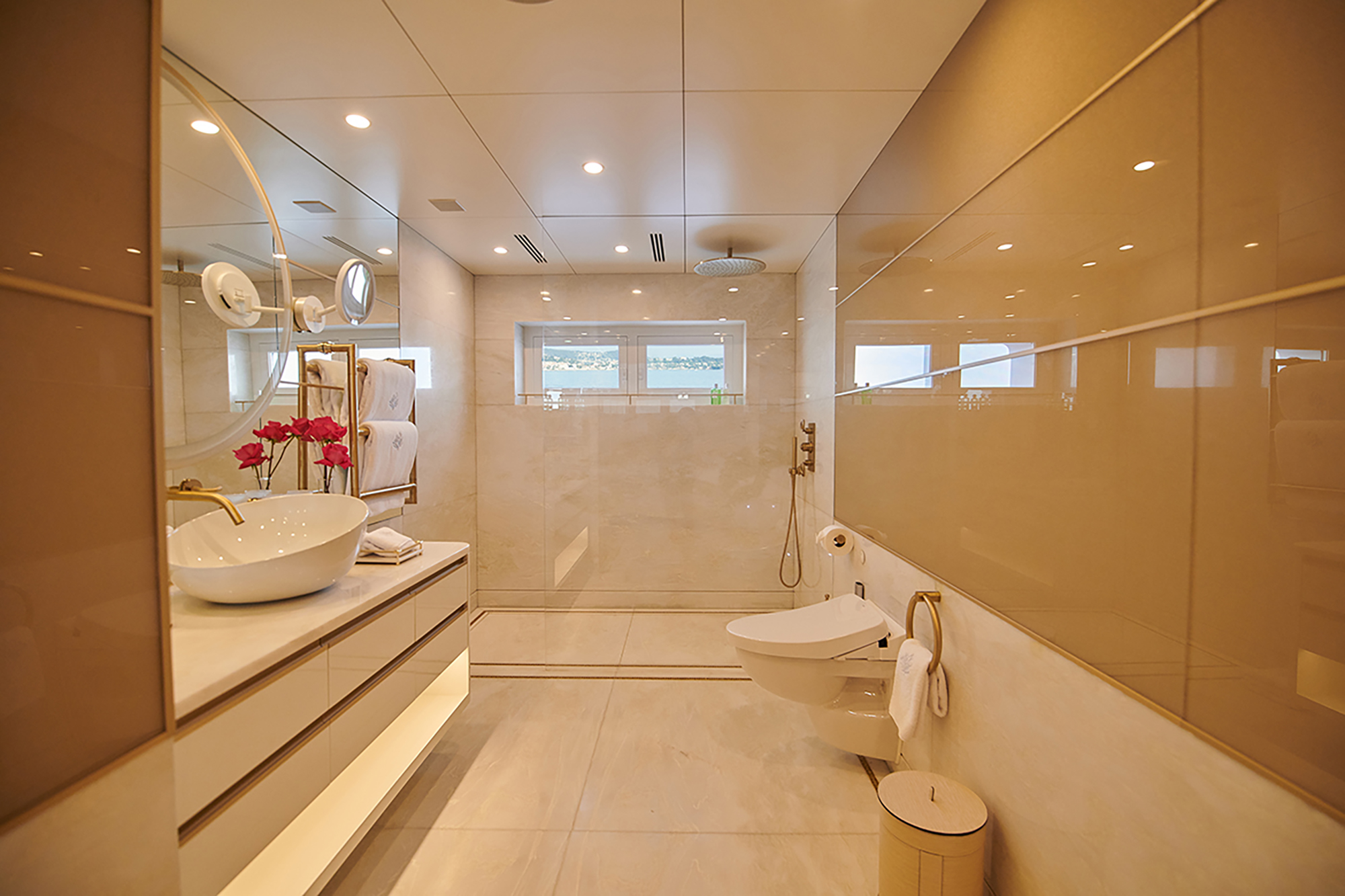 The forward formal dining area is separated from the main salon for a more personal dining experience that centres the attention on the company and the occasion.