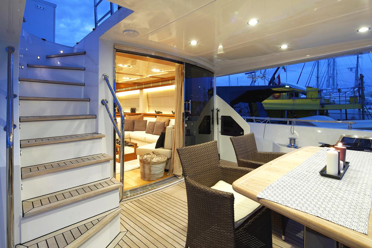 The exterior decks are wonderful on this Marco Polo 78 Fly, with three independent spaces for guests to enjoy.