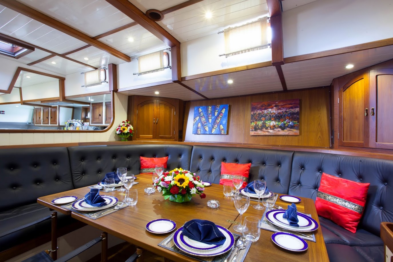 The main salon features and open plan lounge and dining space, comfortably seating guests for relaxation and formal meals. Below decks, the yacht is fully air conditioned. Guest accommodation is fore and aft of the salon.