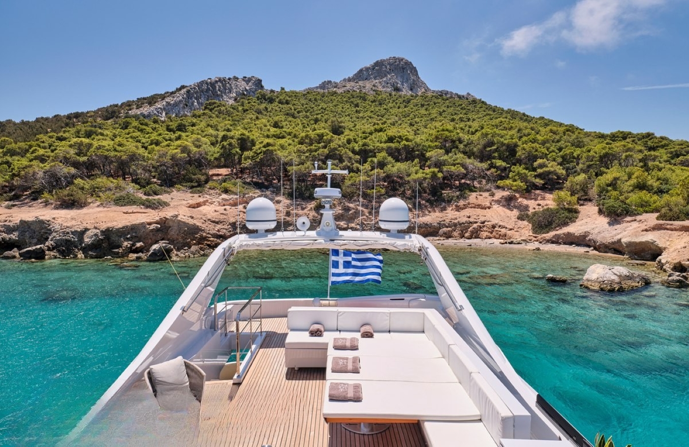 Exterior space is plentiful laid out over 2 decks. The aft deck is adjacent to the main salon, offering an alfresco dining option, seating, shade and direct access to the salon and stern swim platform. Side decks lead to the foredeck and a large sunpad.