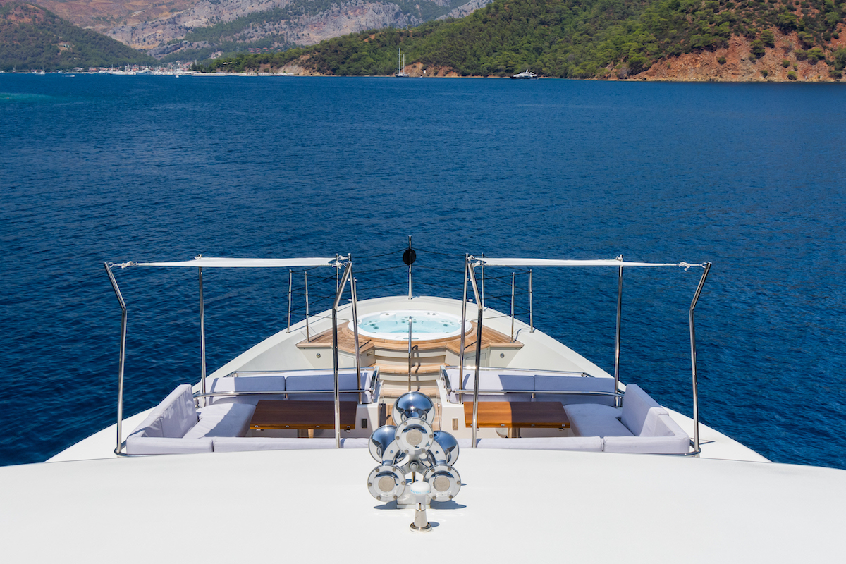 The foredeck offers a symmetrical setting of a corner sofa and drinks table on both sides, a double sunbed in front and a large circular Jacuzzi on the bow which enjoys panoramic views of the destination.