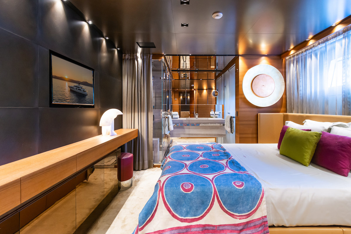 A wet bar is placed forward to port with a widescreen TV in the aft corner, and a long sofa accompanied by a footstool/coffee table lines the starboard side.