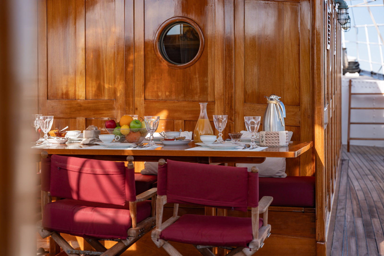 The main deck has 2 alfresco dining options, one just forward of the helm, seating guests comfortably under a Bimini cover if requested. This deck is raised providing uninterrupted views. An additional alfresco dining table is forward, in a more intimate setting, perfect for casual dining.