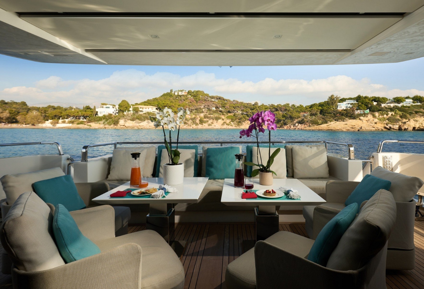 Exterior living is ample over 2 levels. From the salon, doors lead directly to the partially shaded aft deck and relaxation area. For water enthusiasts, the extended swim platform is the ideal water activity centre.