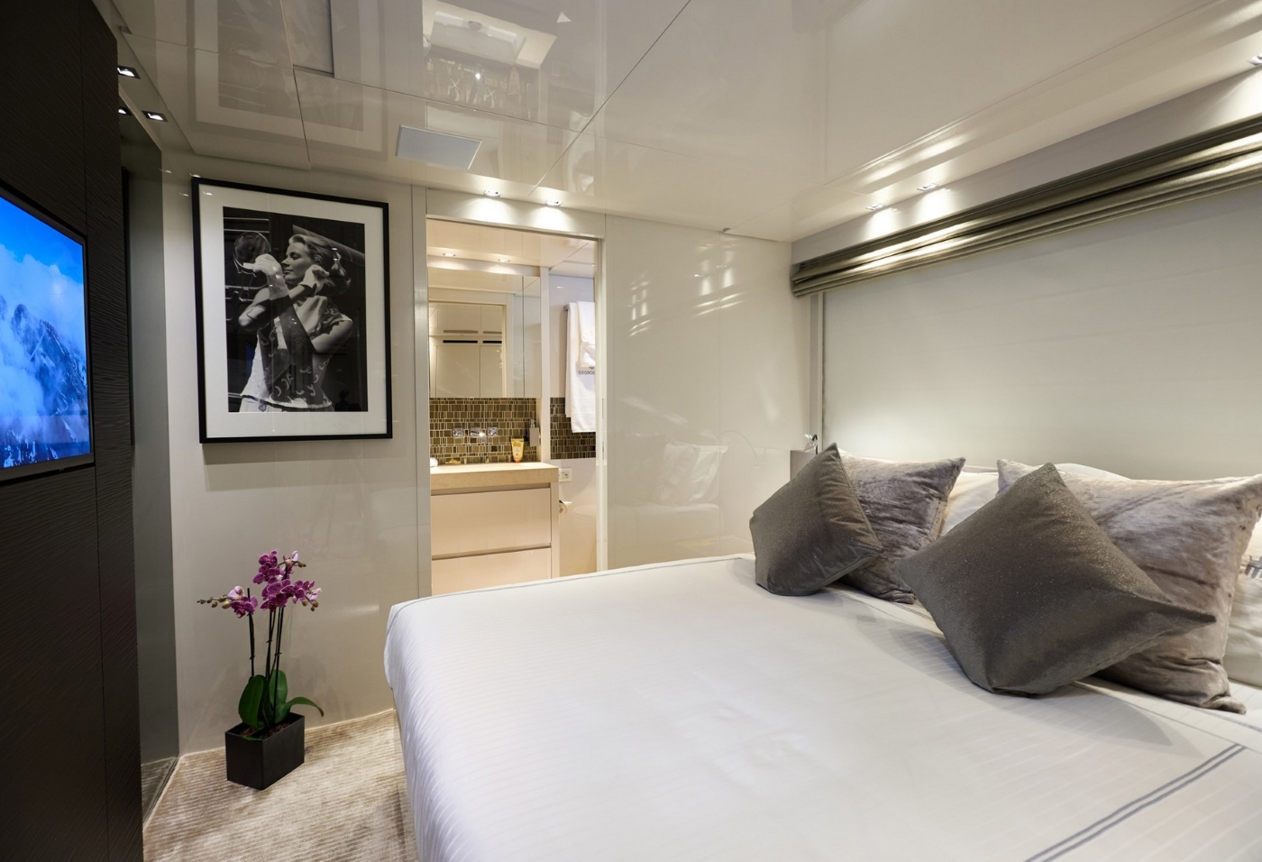 Accommodation is in 5 en-suite cabins, for 11 guests. The master stateroom is located on the main deck, forward of the salon and dining. The master cabin offers a queen-size bed, vanity, generous en-suite with a tub and plenty of storage.