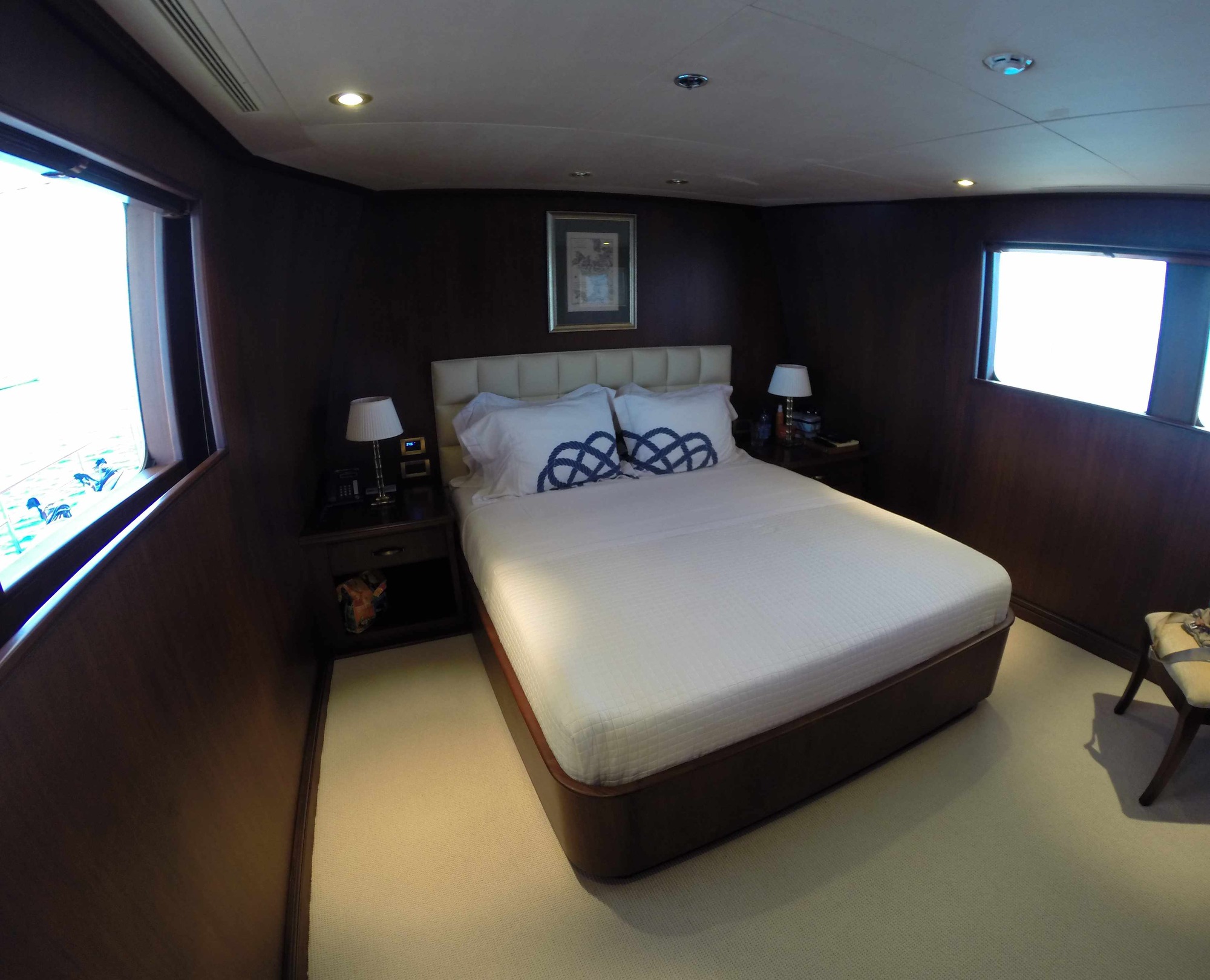 On the main deck has a generous salon lounge aft, offering opposing plush sofas, occasional chairs and coffee tables. The soft furnishing tones are elegantly neutral, with subtle bespoke detailing. Surrounding panoramic windows bring in plenty of natural light, while fitted blinds ensure optimum privacy.