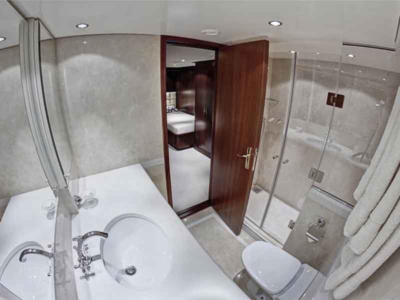 The master stateroom is on the main deck forward of the salon, with a full beam layout, center lined queen size bed, large ensuite and walk in wardrobe. Her VIP cabin is on the upper deck aft of the bridge, with a queen size bed. Below decks is a further VIP cabin, with a full beam layout and queen size bed.