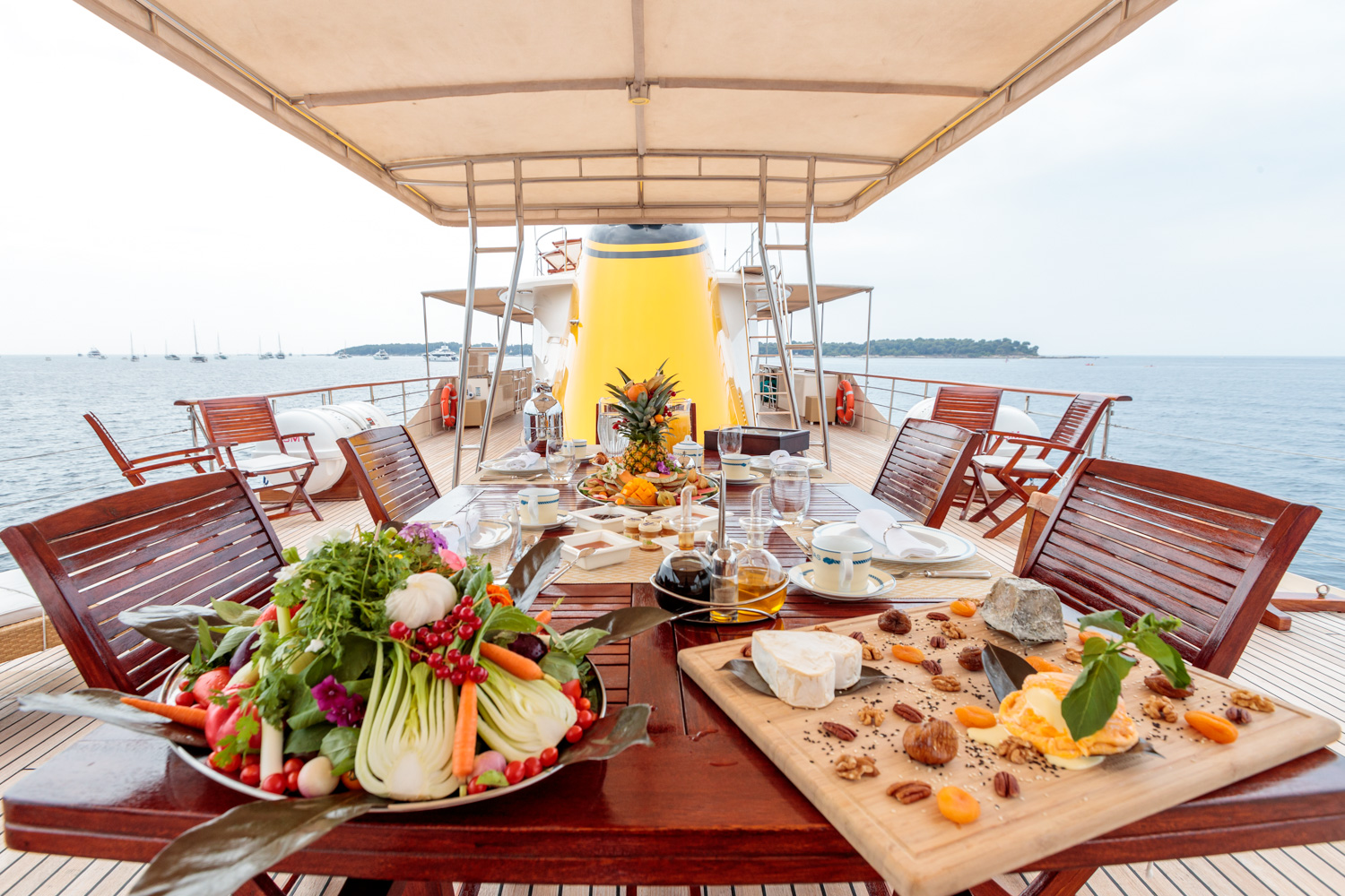 On the main deck has a generous salon lounge aft, offering opposing plush sofas, occasional chairs and coffee tables. The soft furnishing tones are elegantly neutral, with subtle bespoke detailing. Surrounding panoramic windows bring in plenty of natural light, while fitted blinds ensure optimum privacy.