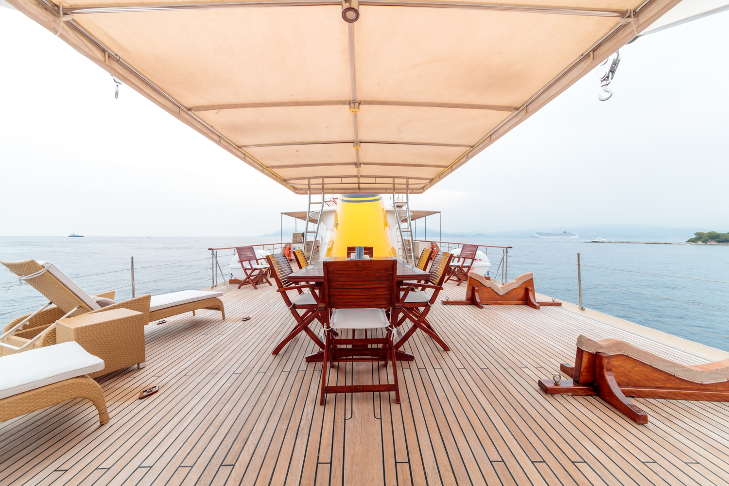 Separate and forward is a stylish and private formal dining room, for up to 10 guests. Accommodation is on 3 levels, with the master stateroom on the main deck forward, the VIP cabin on the upper deck and 3 additional cabins on the lower deck.