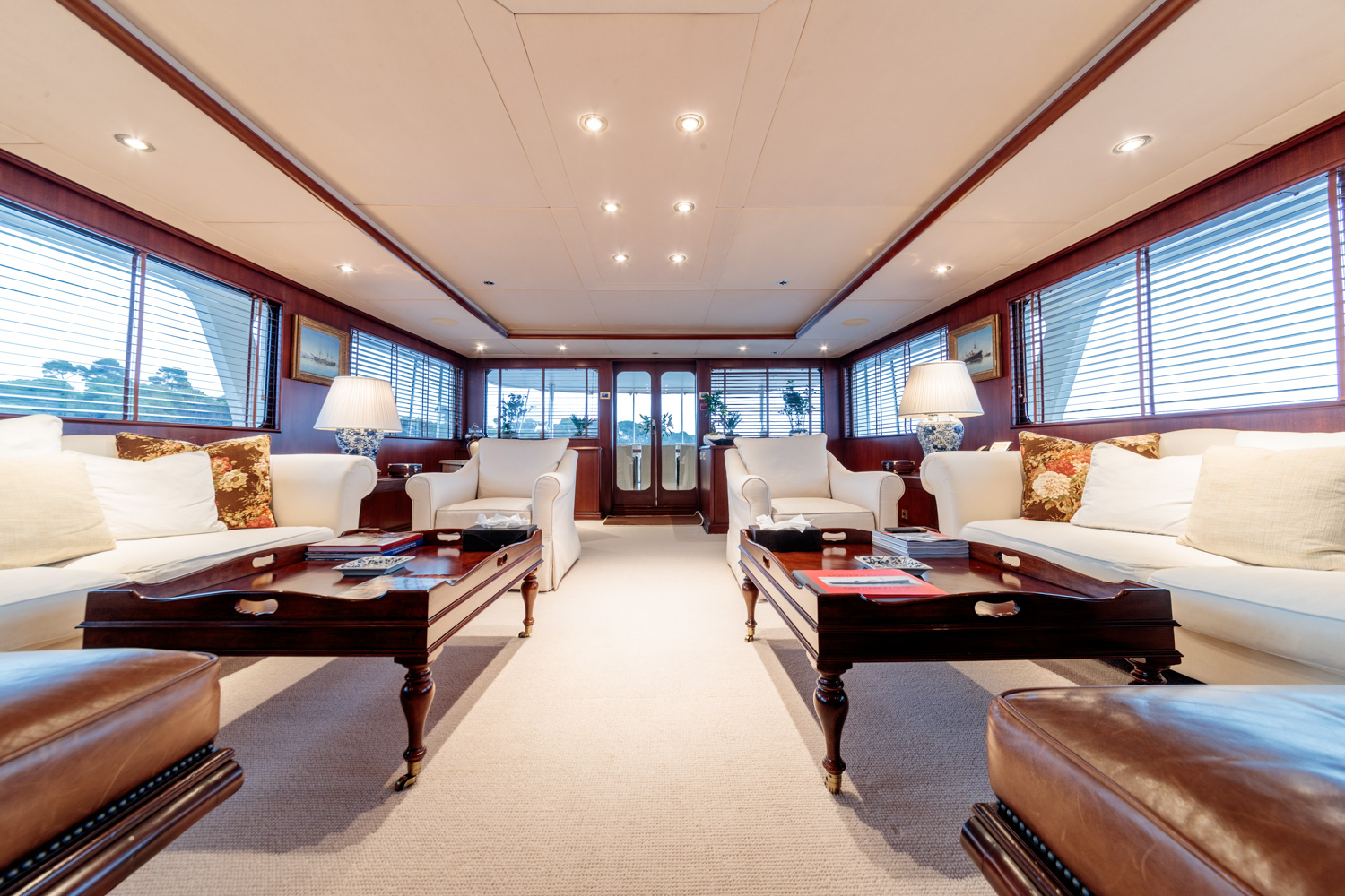 On the main deck has a generous salon lounge aft, offering opposing plush sofas, occasional chairs and coffee tables. The soft furnishing tones are elegantly neutral, with subtle bespoke detailing. Surrounding panoramic windows bring in plenty of natural light, while fitted blinds ensure optimum privacy.