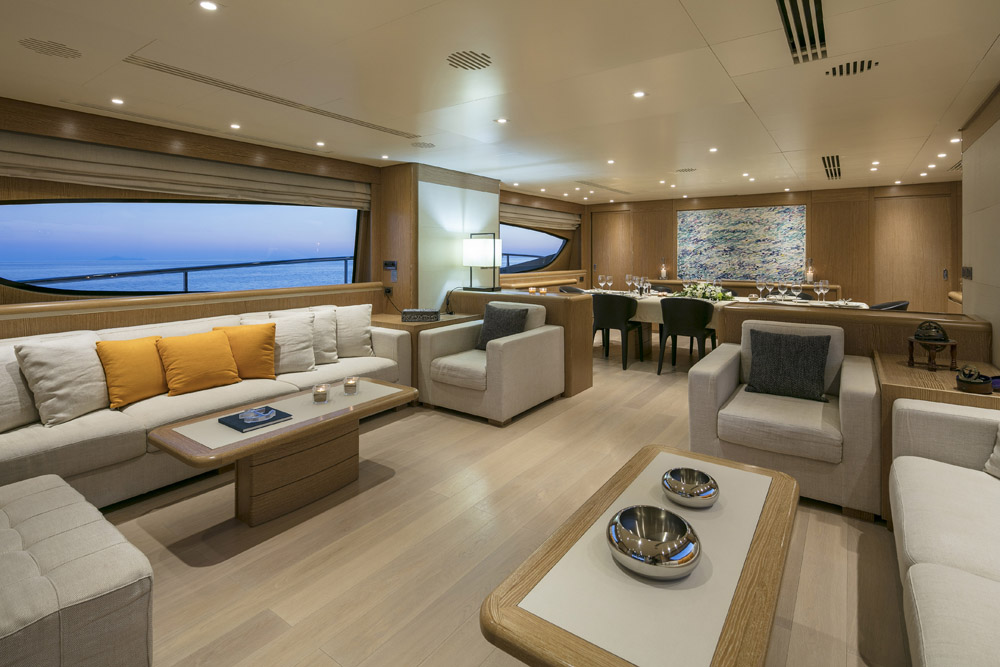 Her open plan salon and dining space is social and elegant. The lounge area offers opposing sofas, occasional chairs and coffee tables aft, while forward is the formal dining table. Elongated side windows allow natural light to fill the space, while boasting spectacular views.