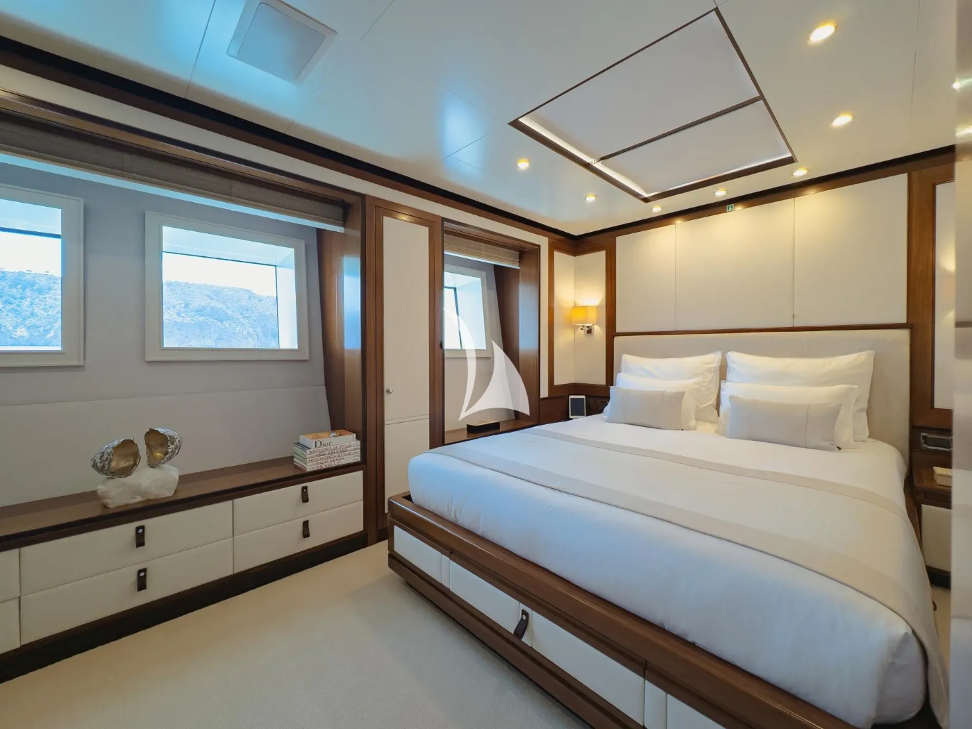 The starboard side foyer leads a day head, followed by a full beam master stateroom with king size bed, vanity, his and hers marble en-suite and spectacular views. On the upper deck is a well-appointed skylounge, complete with ample seating, wet bar and full entertainment systems.
