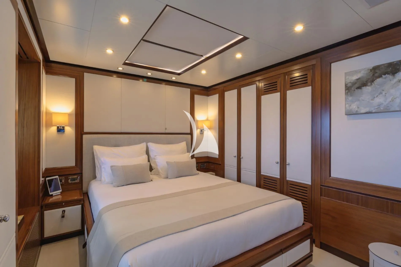 The starboard side foyer leads a day head, followed by a full beam master stateroom with king size bed, vanity, his and hers marble en-suite and spectacular views. On the upper deck is a well-appointed skylounge, complete with ample seating, wet bar and full entertainment systems.