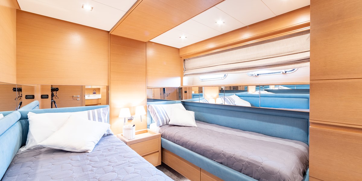 LUDI offers 4 spacious cabins, all with A/C and two of which are en suite: the Master stateroom, with a queen size bed, TV, small desk and sofa and her VIP suite that also comprises a queen size bed and a TV. Her 2 twin cabins are also spacious with a TV in each.