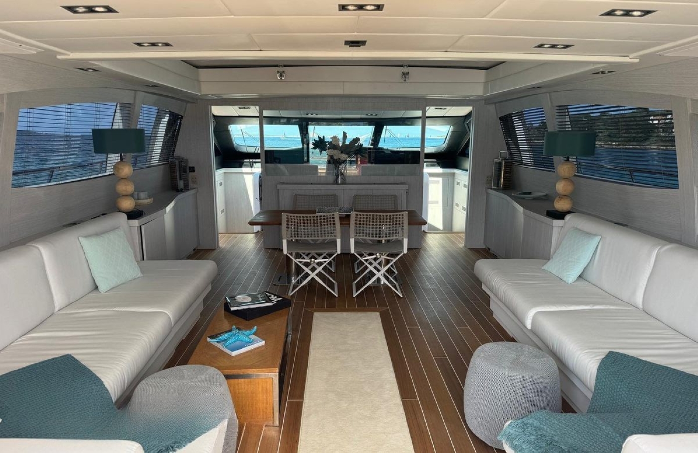 The main salon is configured as an aft lounge and forward dining space with panoramic windows running the full length. The space is semi-open to the forward wheelhouse.