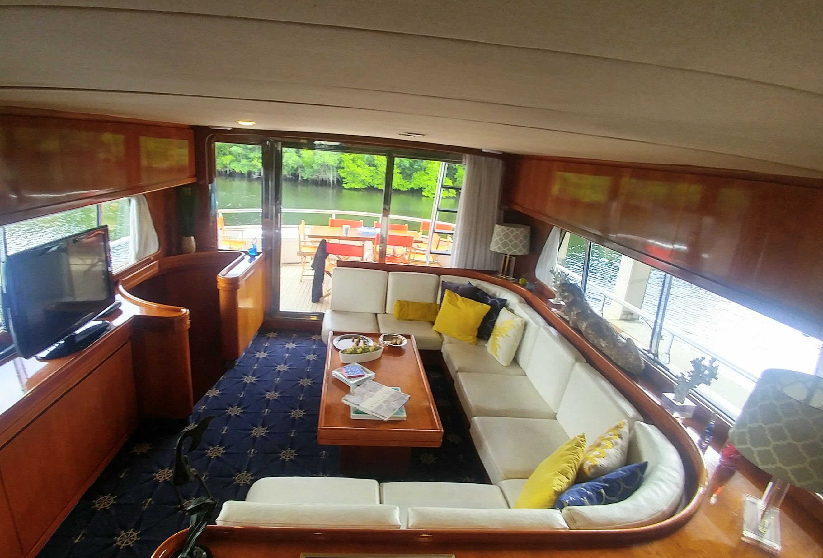 The yacht’s pristine interior is spacious, comfortable and features a grand salon with a wrap around sofa and four person bar.