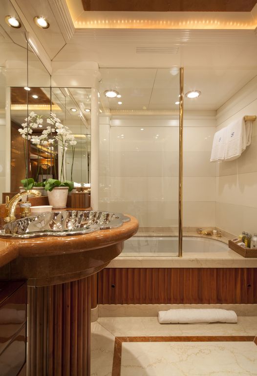 The main master cabin offers a king size bed and an ensuite bathroom with a spa pool bath tub, shower and head. Two further cabins have twin beds and a Pullman bunk as well as ensuite bathrooms with shower and head. There are two cabins with queen sized beds and ensuite, shower and head.