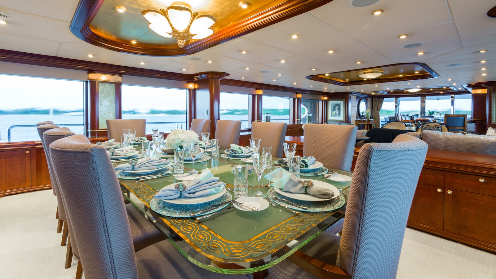 While dining on board, one can choose elegance and grace in the yacht’s enclosed dining room or a more relaxed alfresco dining experience on the air-conditioned aft exterior main deck, the aft exterior pilothouse deck or on the sundeck.