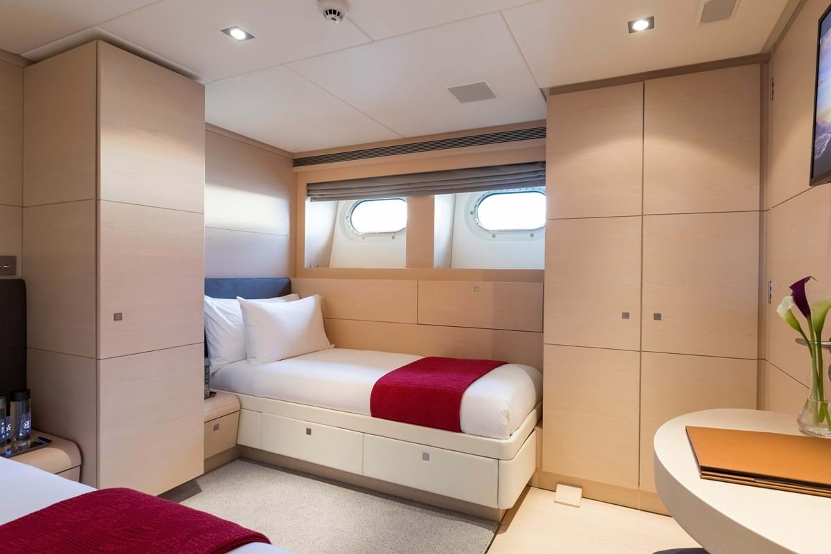 The yacht features a spacious sky lounge, that easily converts from bar and social space to media room. Below decks are four additional guest cabins, consisting of 2 double and two twin cabins, each offering a stylish and serene ambiance.