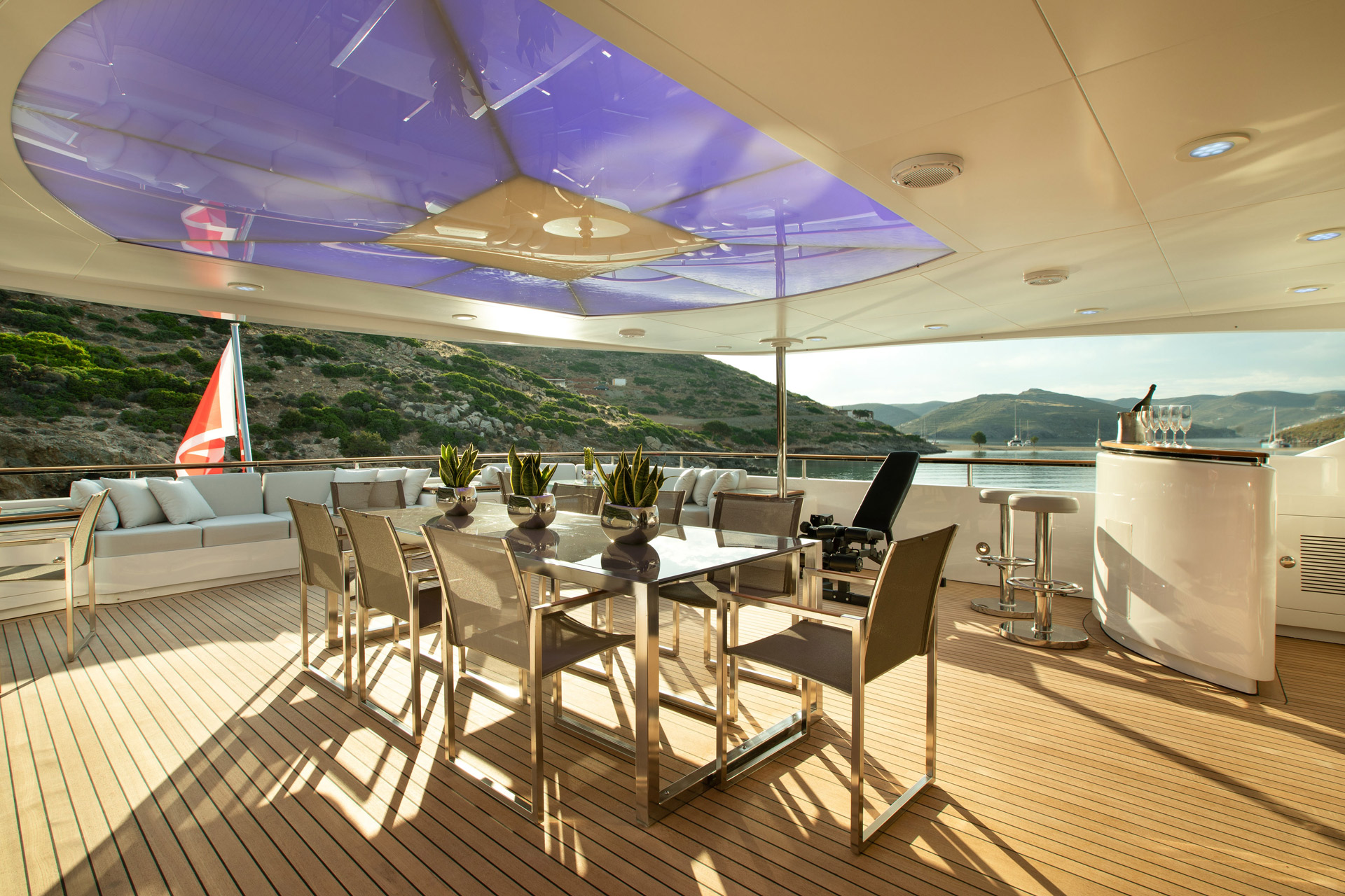 On the upper deck, there is an alfresco dining table to seat six and two smaller tables that make use of the settee fitted into the stern to seat more diners.