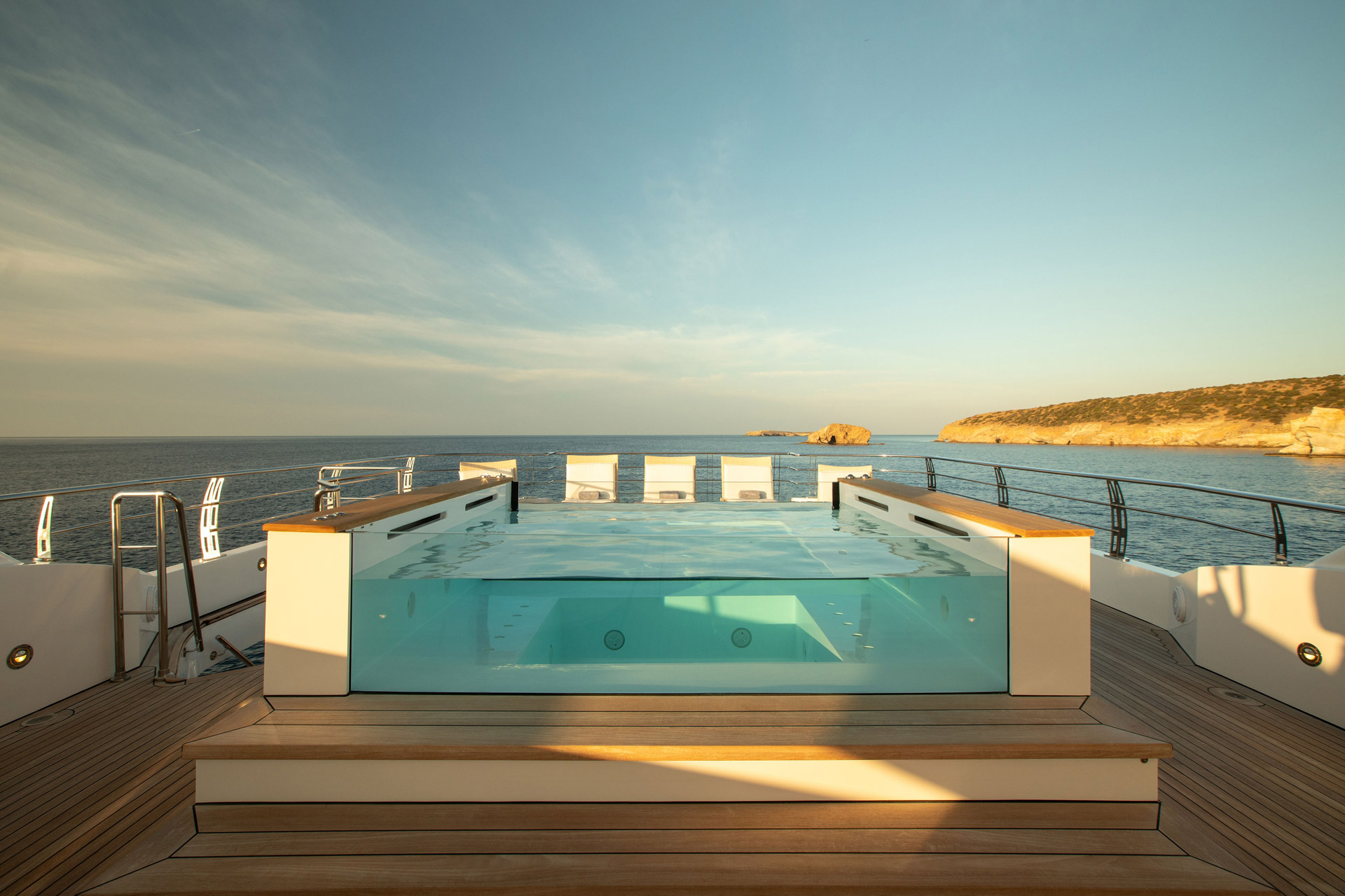 On the main deck aft, the stern is fitted with an elongated sofa where guests can relax in the sun while waiting for the tender and in the shade there is a more extensive lounge setup consisting of a sofa, two armchairs and two tables for outdoor socialising while admiring the aft views.