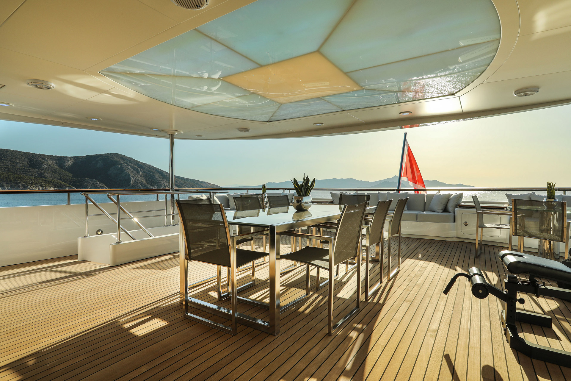 On the upper deck, there is an alfresco dining table to seat six and two smaller tables that make use of the settee fitted into the stern to seat more diners.