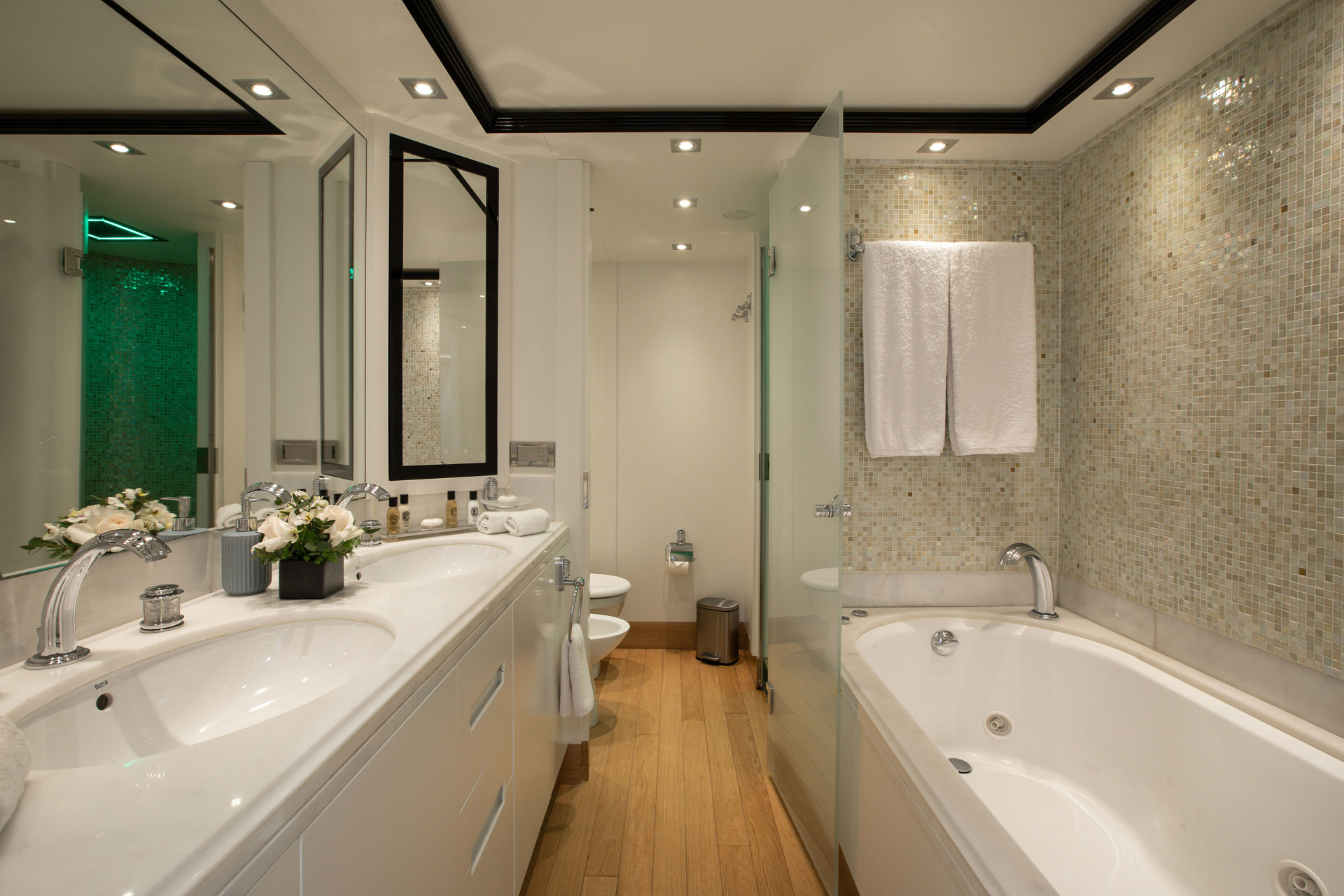 Around the edge there are sun loungers and the raised Jacuzzi is situated in the centre in the sunshine. Under the hardtop there are two bench-like tables and beach chairs for casual alfresco dining. The forward bar has an ...