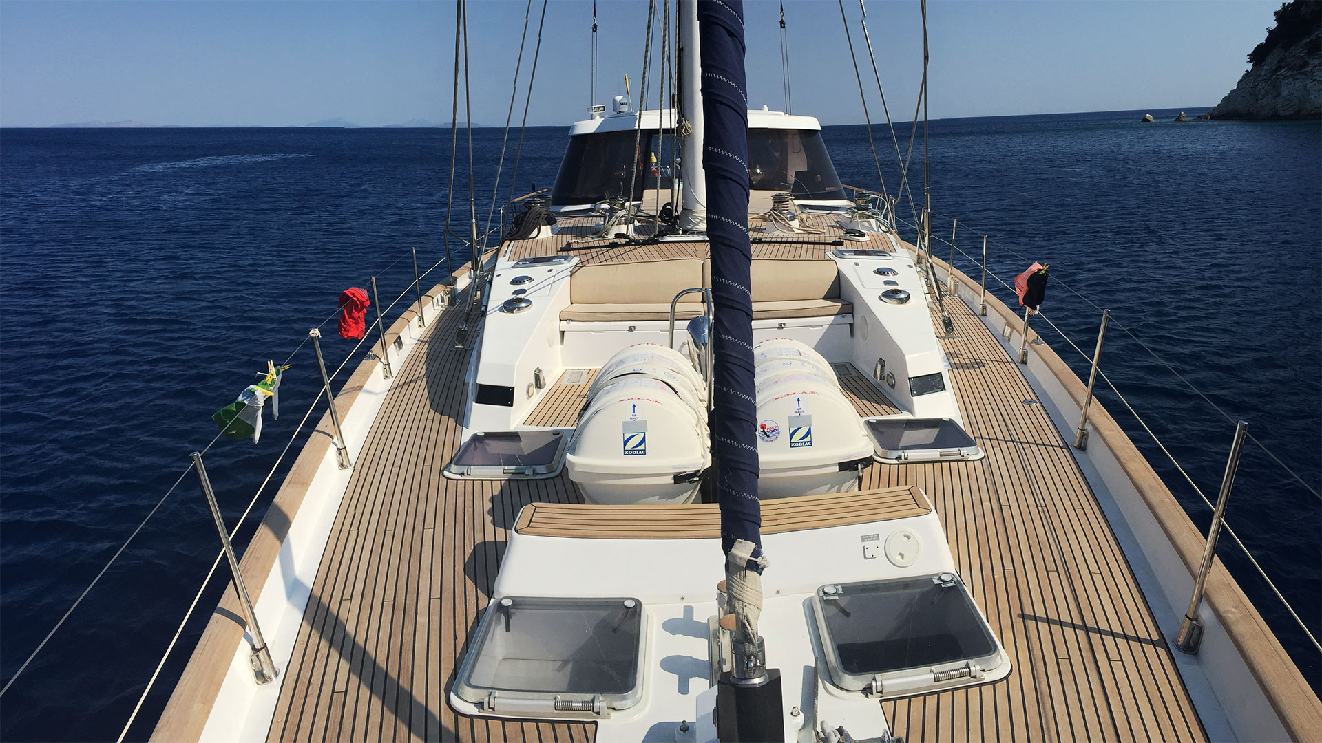 On the foredeck is an additional seating and sunning space. Her decks are all laid to beautiful teak.