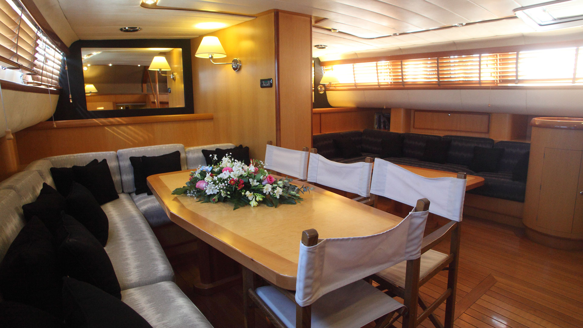 Her ample main salon offers an open plan formal dining and lounge space. The lounge is set to starboard and has plush seating and a coffee table, while to port is a generous formal dining area and TV entertainment. Accommodation is aft of the salon, in 1 master, 1 VIP and 1 twin cabin.