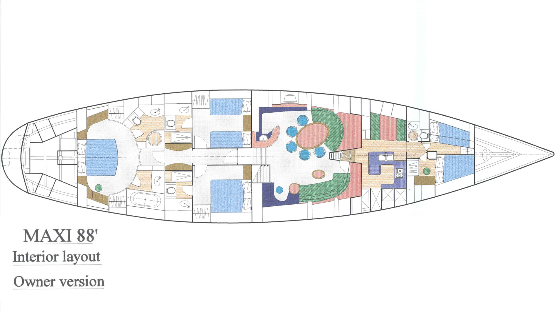Below decks she has a contemporary timeless ambiance, with warm woods of Wild Cherry and Maple, and bespoke soft furnishings.