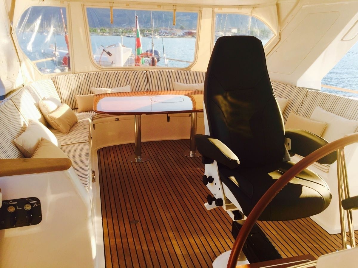 Below decks she has a contemporary timeless ambiance, with warm woods of Wild Cherry and Maple, and bespoke soft furnishings.
