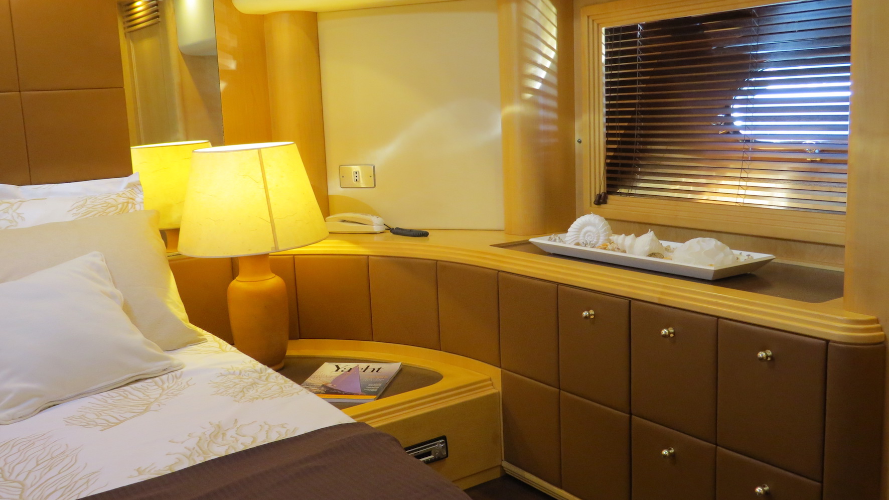 Her interior decors are elegant and relaxing. Neutral tones, chic leathers, stylish soft furnishings and fine woods, create a welcome and sophisticated ambiance. On the lower deck is a cosy salon with plush seating and coffee table.
