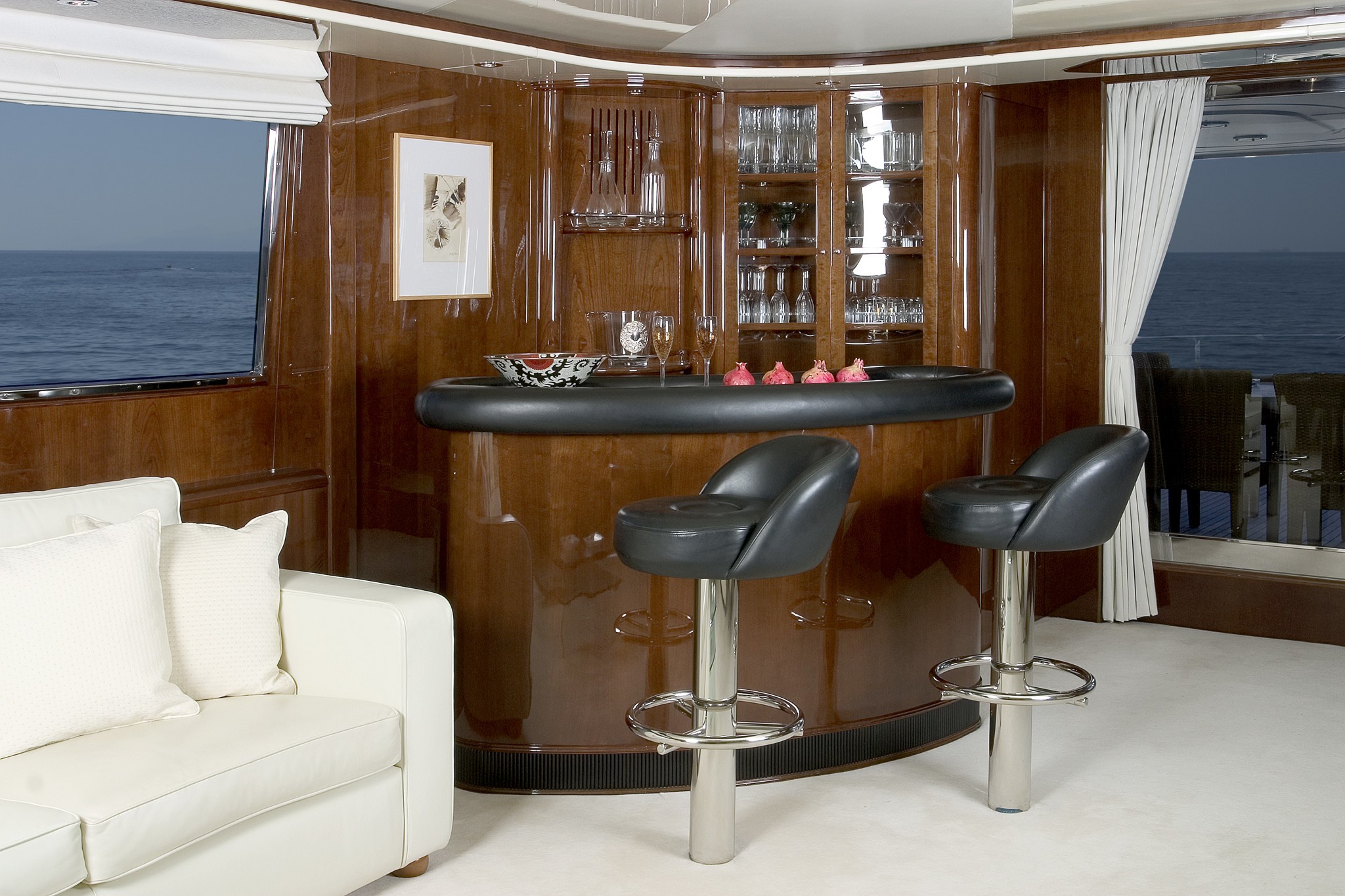 Omega Architects created M/Y Let It Be M’s exterior styling and interior design. Her interior features a lovely semi-gloss cherry wood with walnut accents throughout.